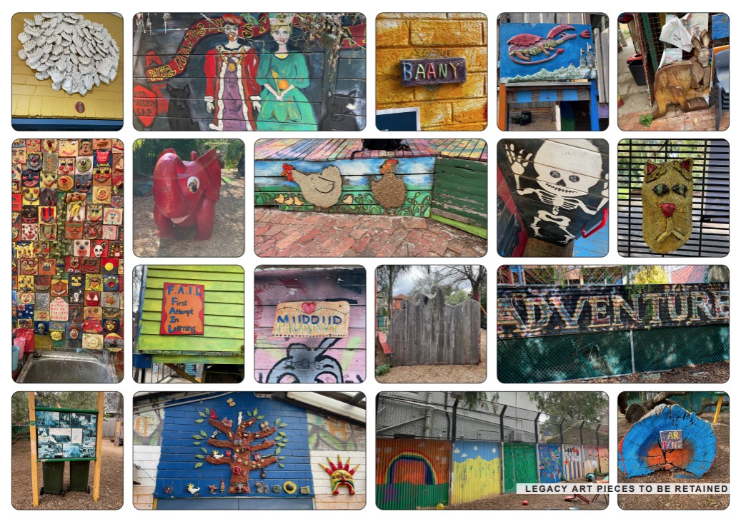 Where possible, beloved art works and unique items created by the children over the years will be carefully removed with the assistance of park staff for installation into the new playground. A detailed inventory of these items has been developed.